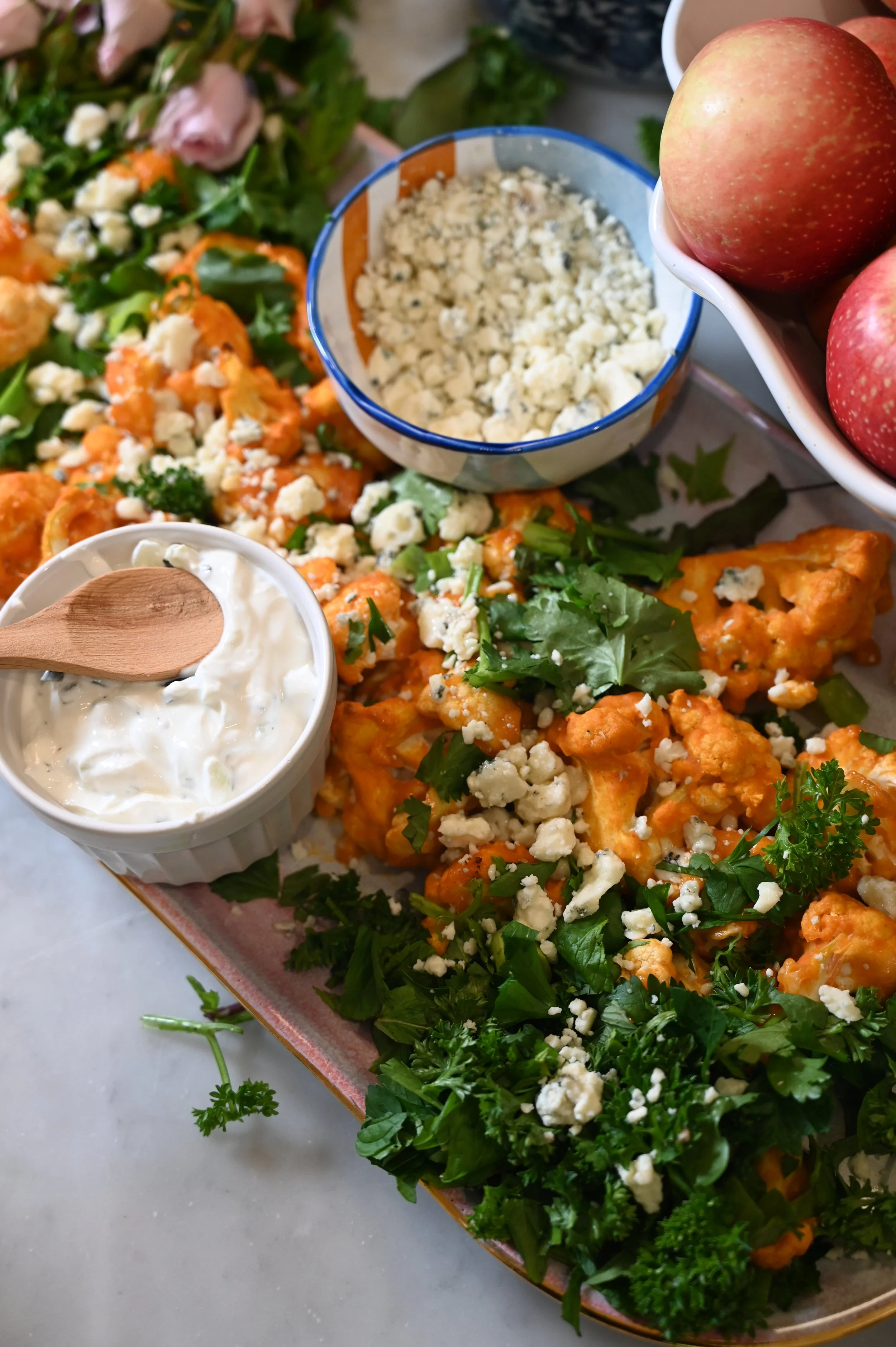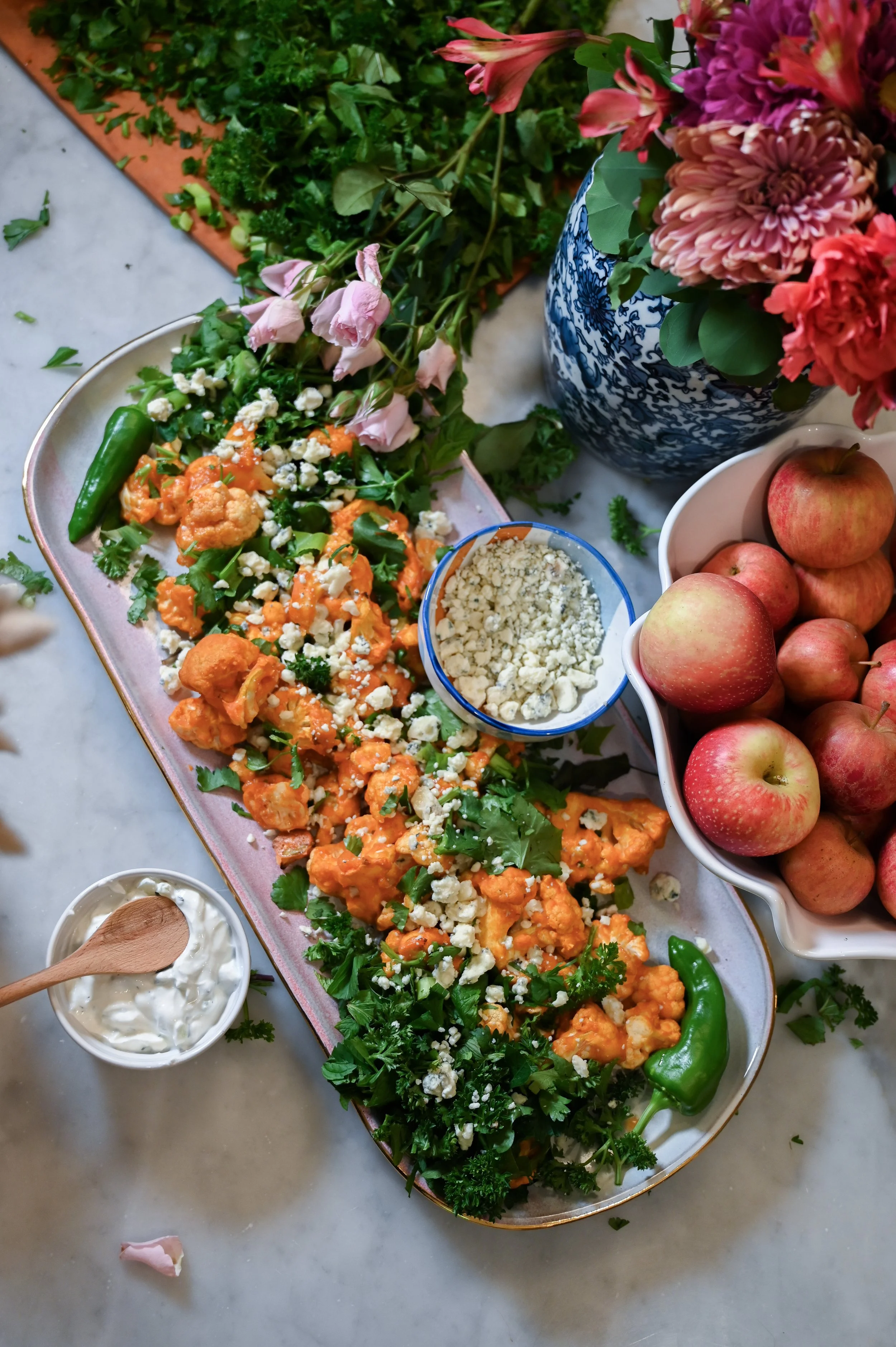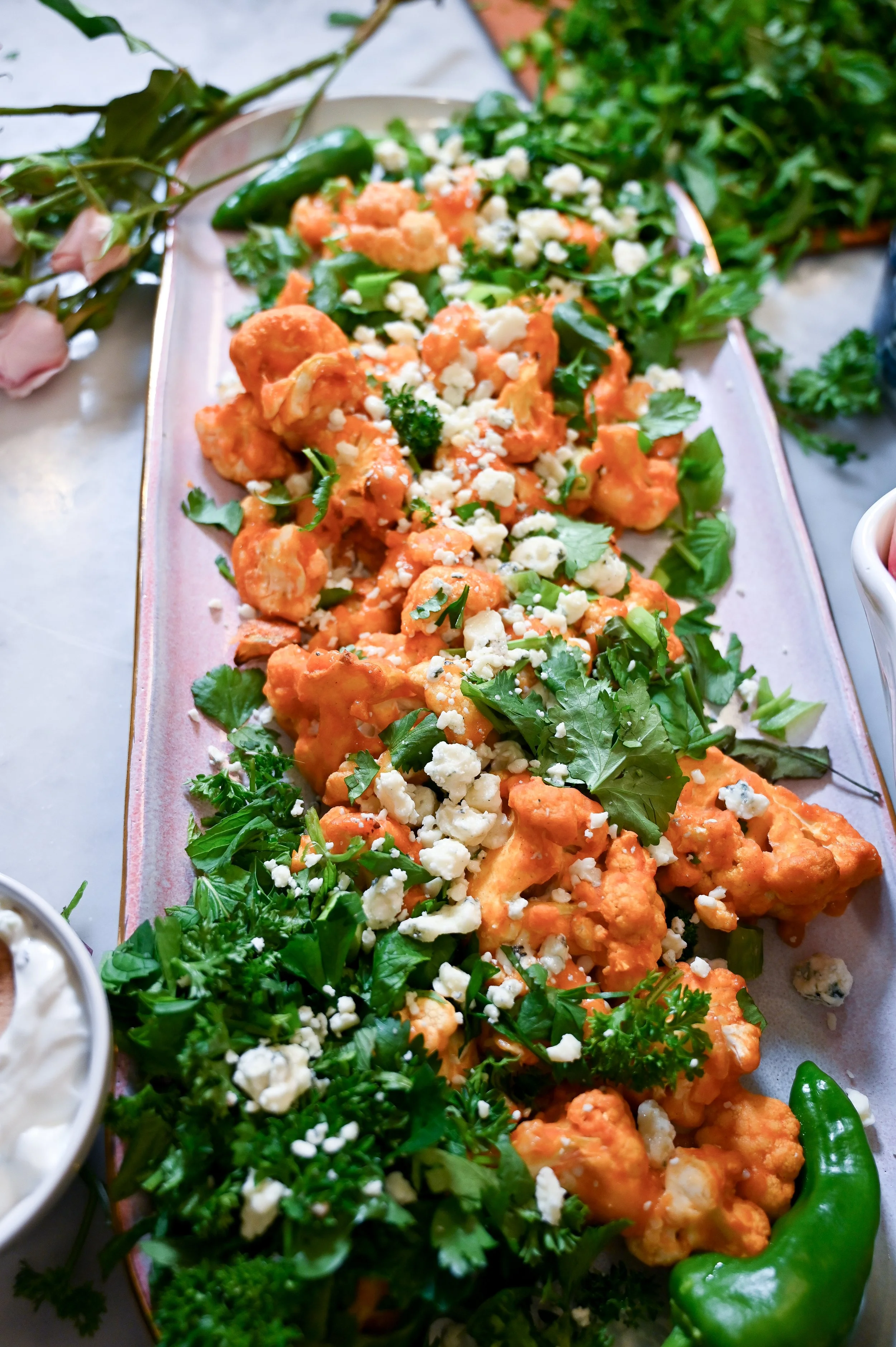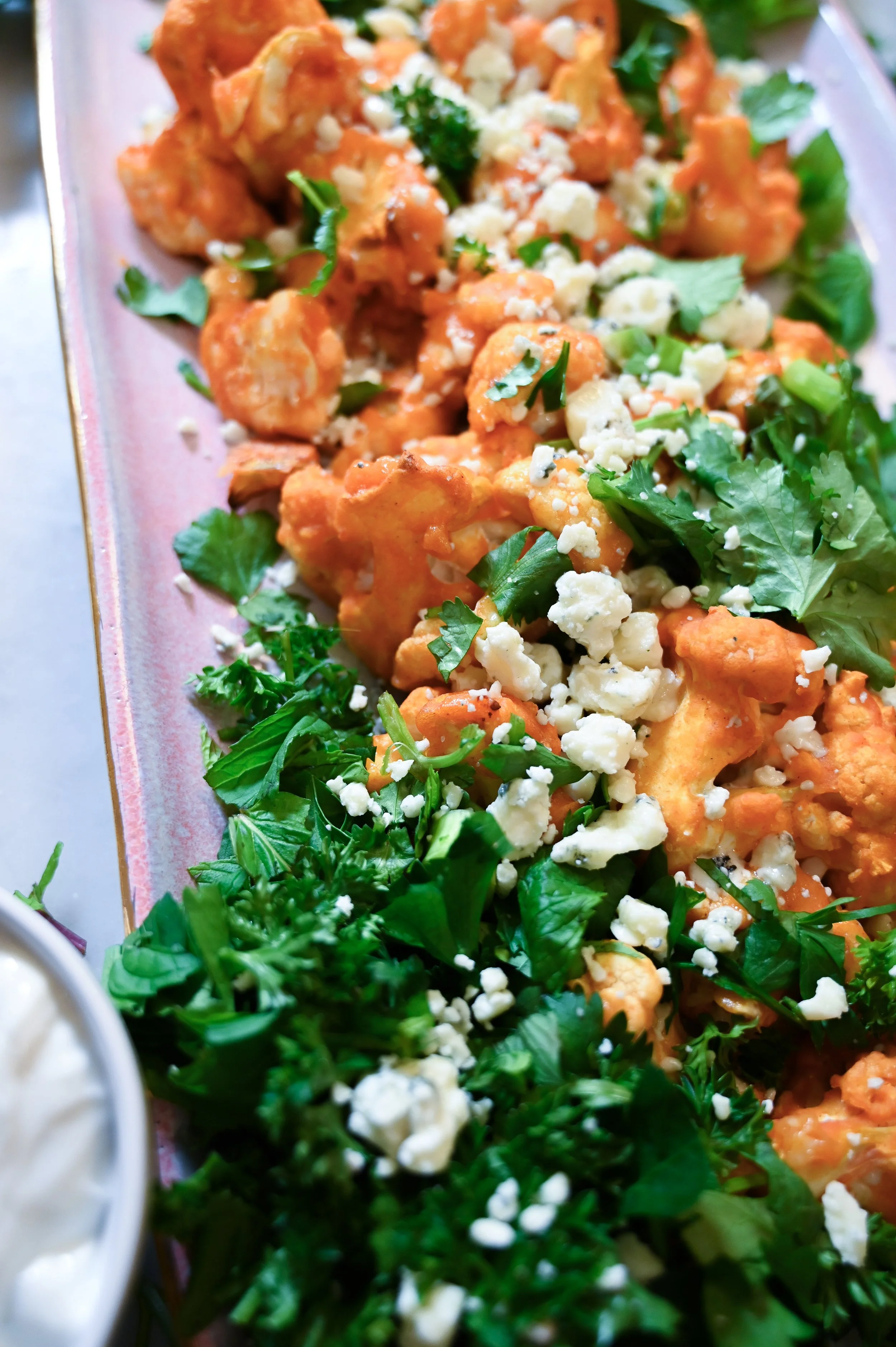This beautiful appetizer will be perfect to bring to any fall event! Whether you’re needing to bring a special app for a girls night, or you’re hosting a football viewing party, this easy Blue Mint Buffalo Cauliflower will hit every button for you. It is loaded full of colorful green herbs like parsley, cilantro, green onions, and my favorite- MINT! You would never think to throw mint together with a buffalo edge, but once you try this, there is no going back. I made it as a little platter just for my kids and hubby to snack on when they got home from their sporting events on this sunny, fall Saturday afternoon, while the Minnesota Football game was playing in the background. Making the most utterly perfect afternoon. This recipe was inspired by a restaurant styled buffalo appetizer that you would find maybe even at the state fair… but it will leaving you feeling so much healthier than one that you would order from the menu! It is absolutely bursting with flavor in all the ways that make you FEEL GOOD.